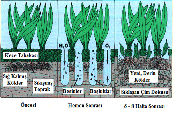 Çim sahalarda yapılan kök havalandırma işlemi sayesinde çimler daha sağlıklı kalabilmektedir. İdeal uygulama en azından yılda bir kez kök havalandırmasının yapılmasıdır ancak maalesef bu nadir görülen bir uygulamadır.